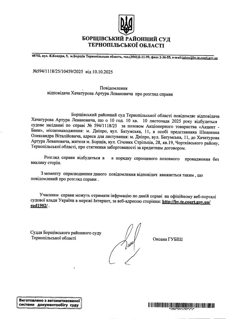 Повідомлення відповідача Хачатурова Артура Левановича про розгляд справи