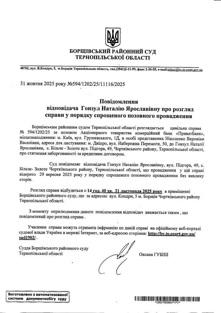 Повідомлення відповідача Гонзул Наталії Ярославівни про розгляд справи у порядку спрощеного позовного провадження