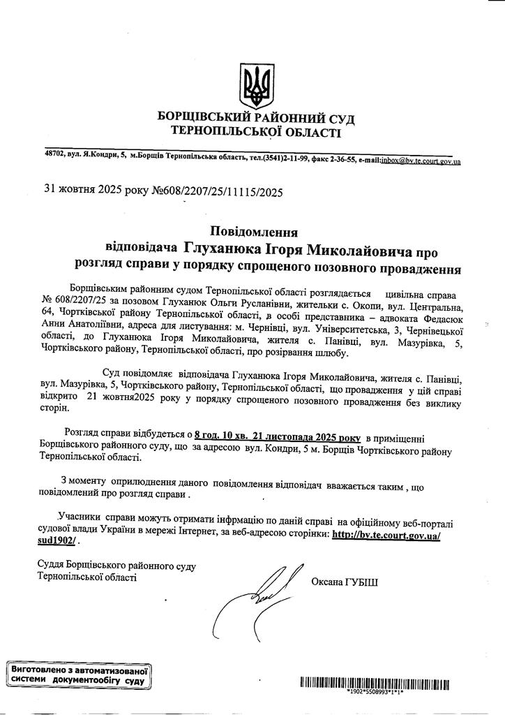 Повідомлення відповідача Глуханюка Ігоря Миколайовича про розгляд справи у порядку спрощеного позовного провадження