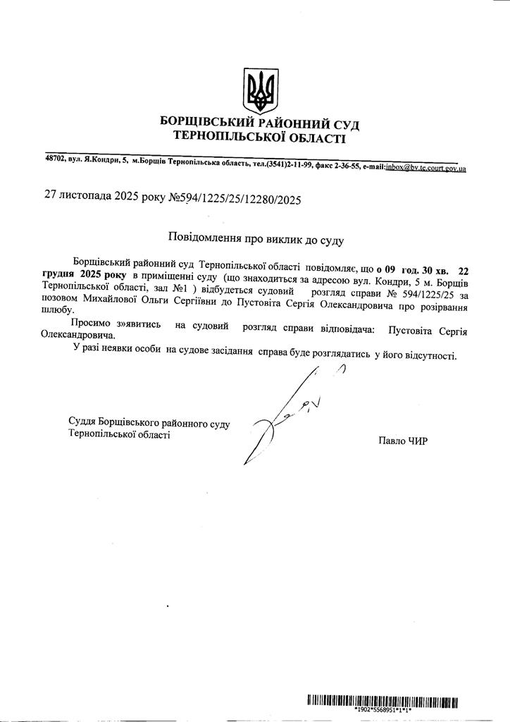 Повідомлення про виклик до суду Пустовіта Сергія Олександровича