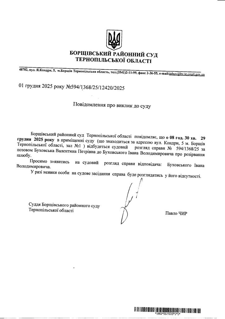 Повідомлення про виклик до суду Буховського Івана Володимировича