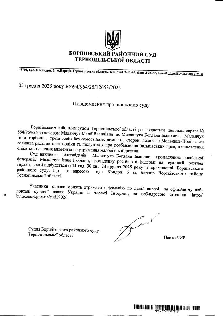 Повідомлення про виклик до суду Маланчук Інни Ігорівни