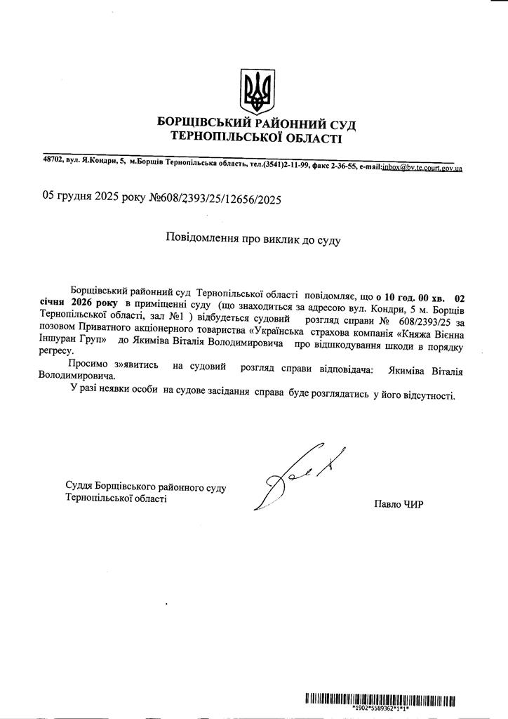 Повідомлення про вилки до суду Якиміва Віталія Володимировича