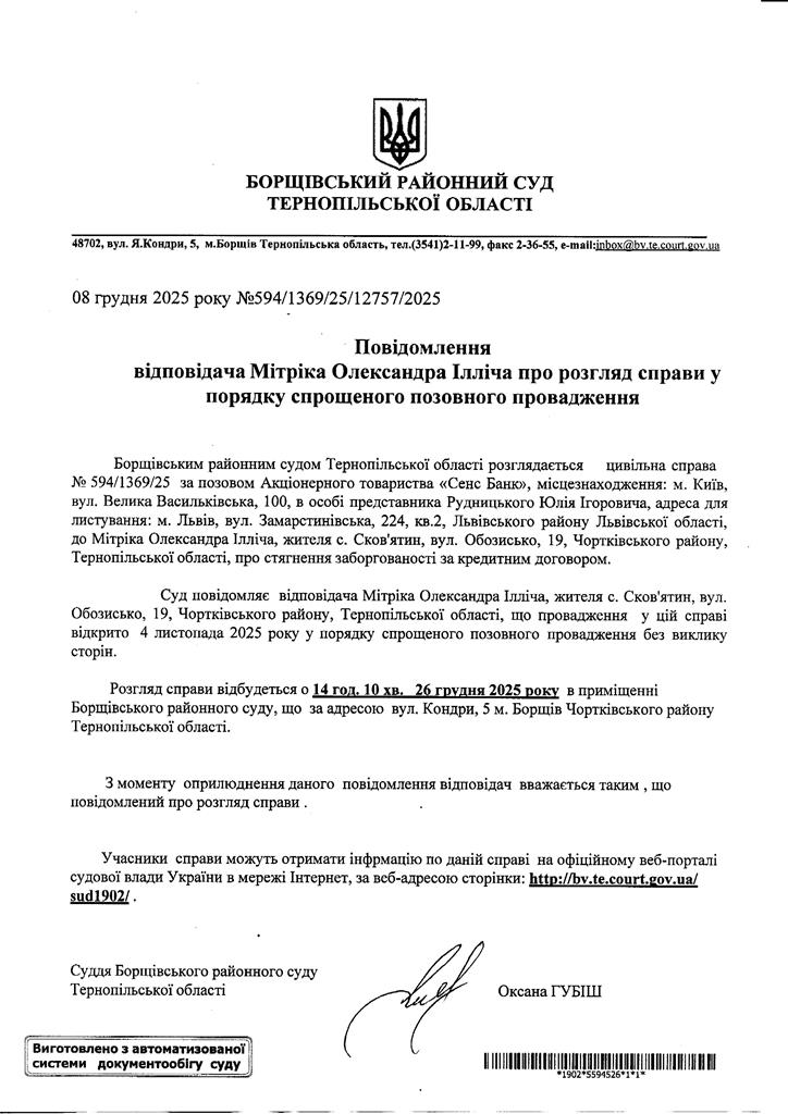 Повідомлення відповідача Мітріка Олександра Ілліча про розгляд справи у порядку спрощеного позовного провадження