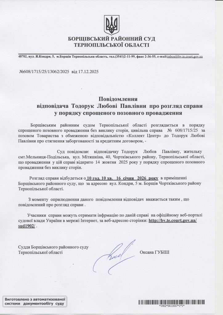Повідомлення відповідача Тодорук Любові Павлівна про розгляд справиу порядку спрощеного позовного провадження