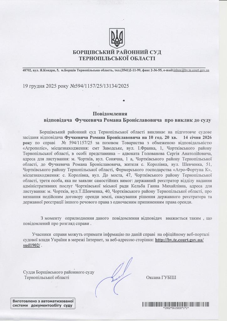 Повідомлення відповідача Фучкевича Романа Броніславовича про виклик до суду