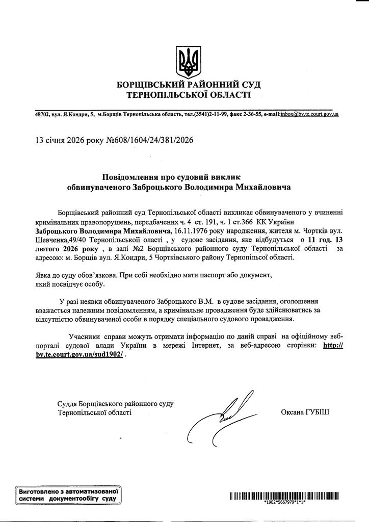 Повідомлення про судовий виклик обвинуваченого Заброцького Володимира Михайловича
