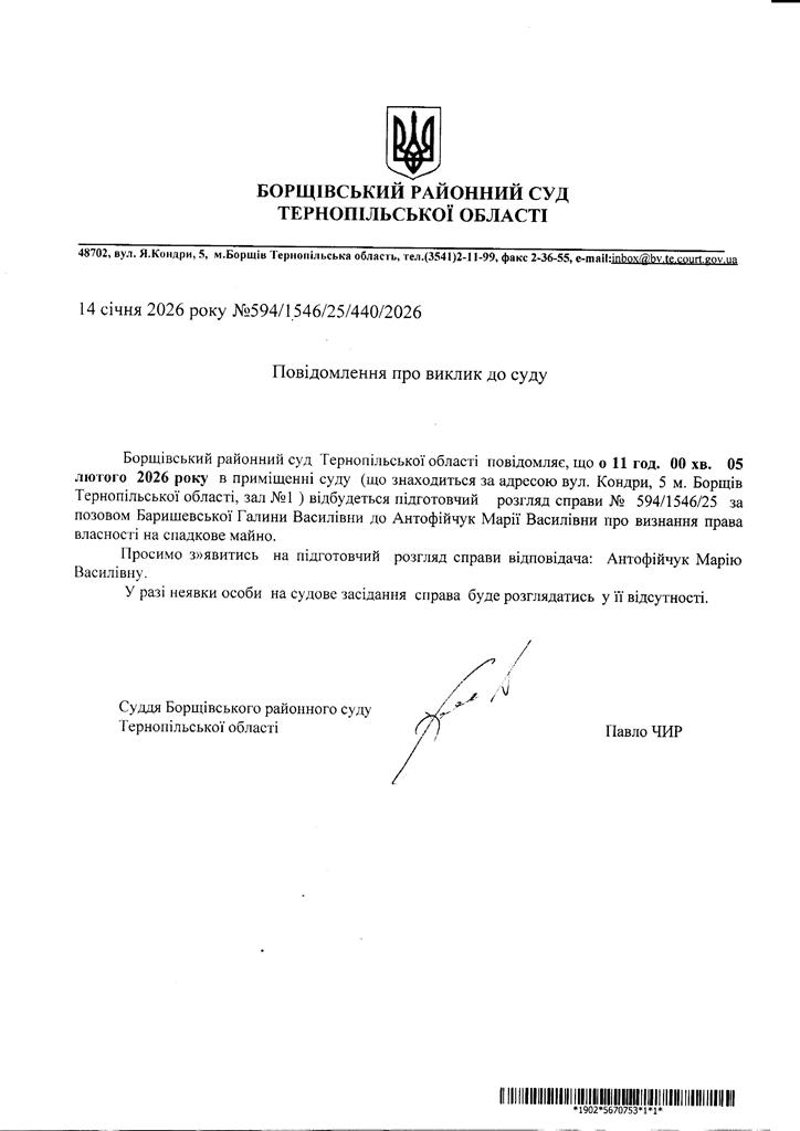 Повідомлення про виклик до суду Антофійчук Марію Василівну