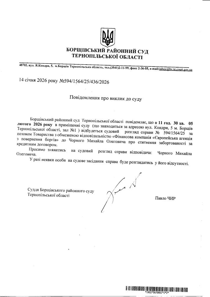 Повідомлення про виклик до суду Чорного Михайла Олеговича