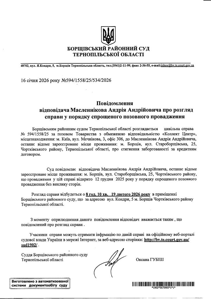 Повідомлення відповідача Масленнікова Андрія Андрійовича про розгляд справи у порядку спрощеного позовного провадження