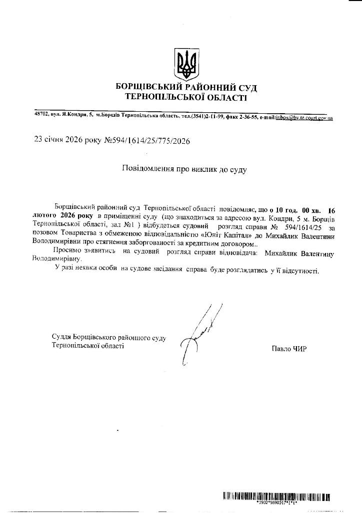 Повідомлення про виклик до суду Михайлик Валентину Володимирівну