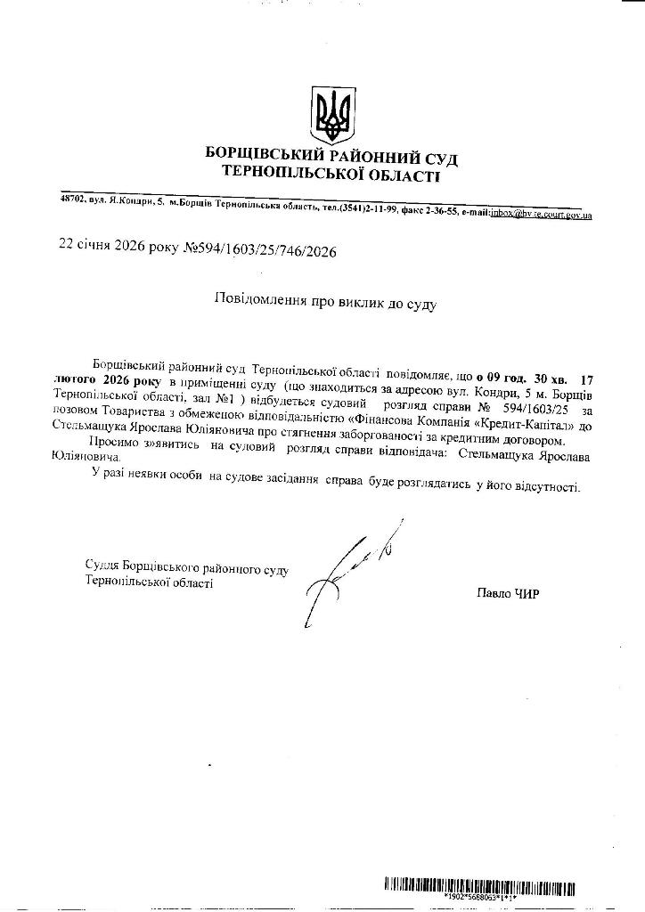 Повідомлення про виклик до суду Стельмащука Ярослава Юліяновича