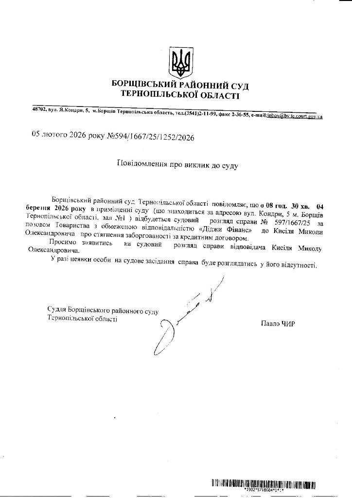 Повідомлення про виклик до суду Кисіля Миколу Олександровича