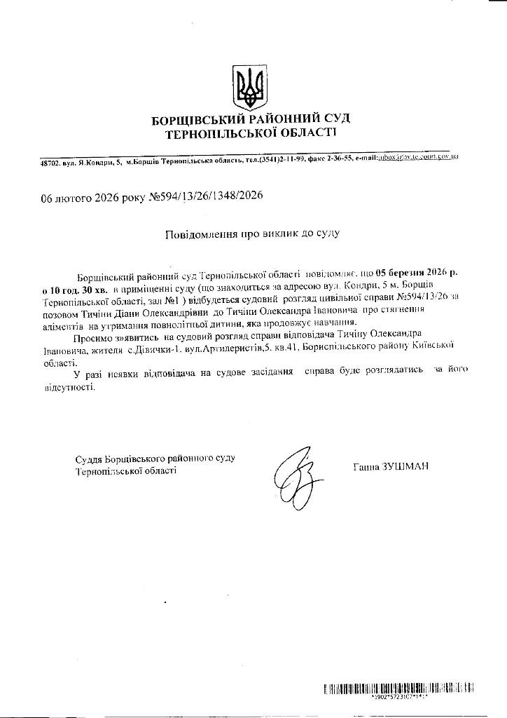 Повідомлення про виклик до суду Тичіна Олександра Івановича