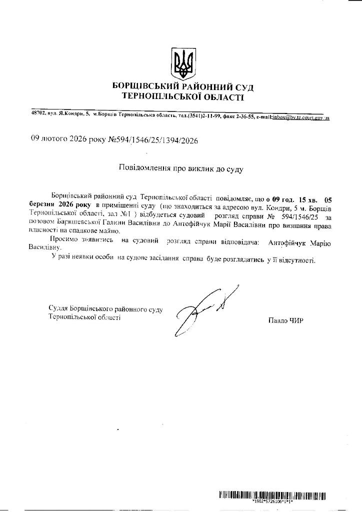 Повідомлення про виклик до суду Антофійчук Марію Василівну