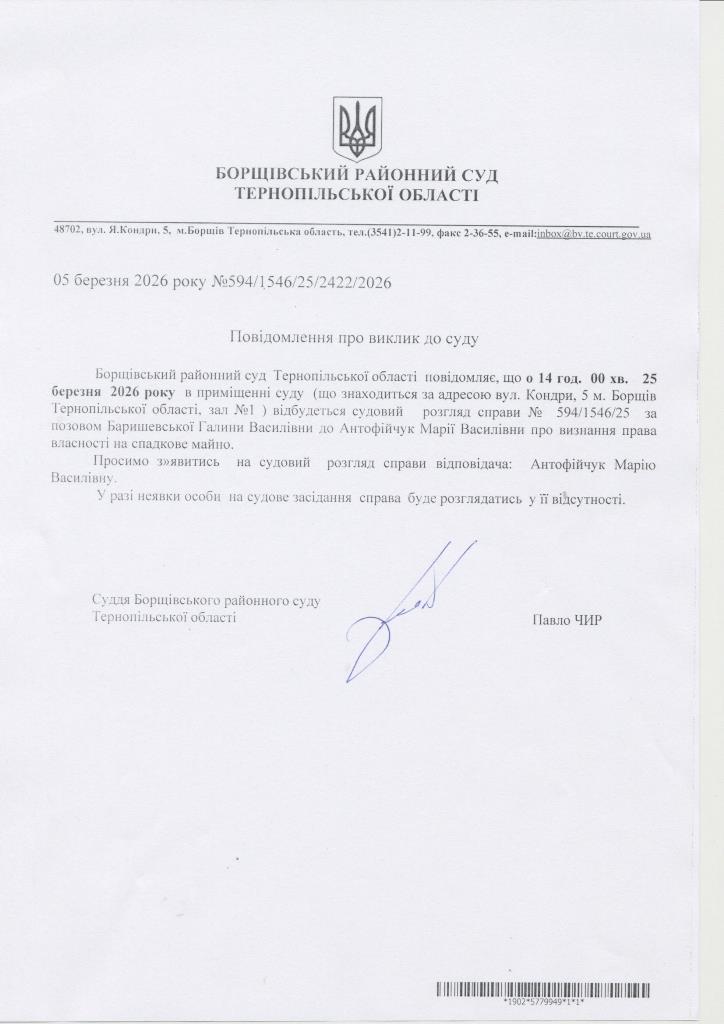 Повідомлення про виклик до суду Антофійчук Марію Василівну
