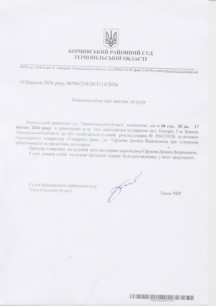 Повідомлення про виклик до суду Єфімова Дениса Вадимовича