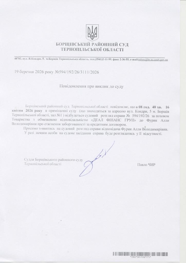 Повідомлення про виклик до суду Фурик Алли Володимирівни