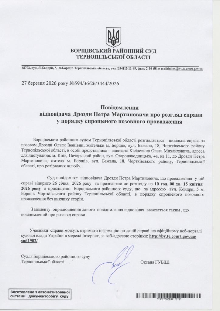 Повідомлення відповідача Дрозди Петра Мартиновича про розгляд справи у порядку спрощеного позовного провадження