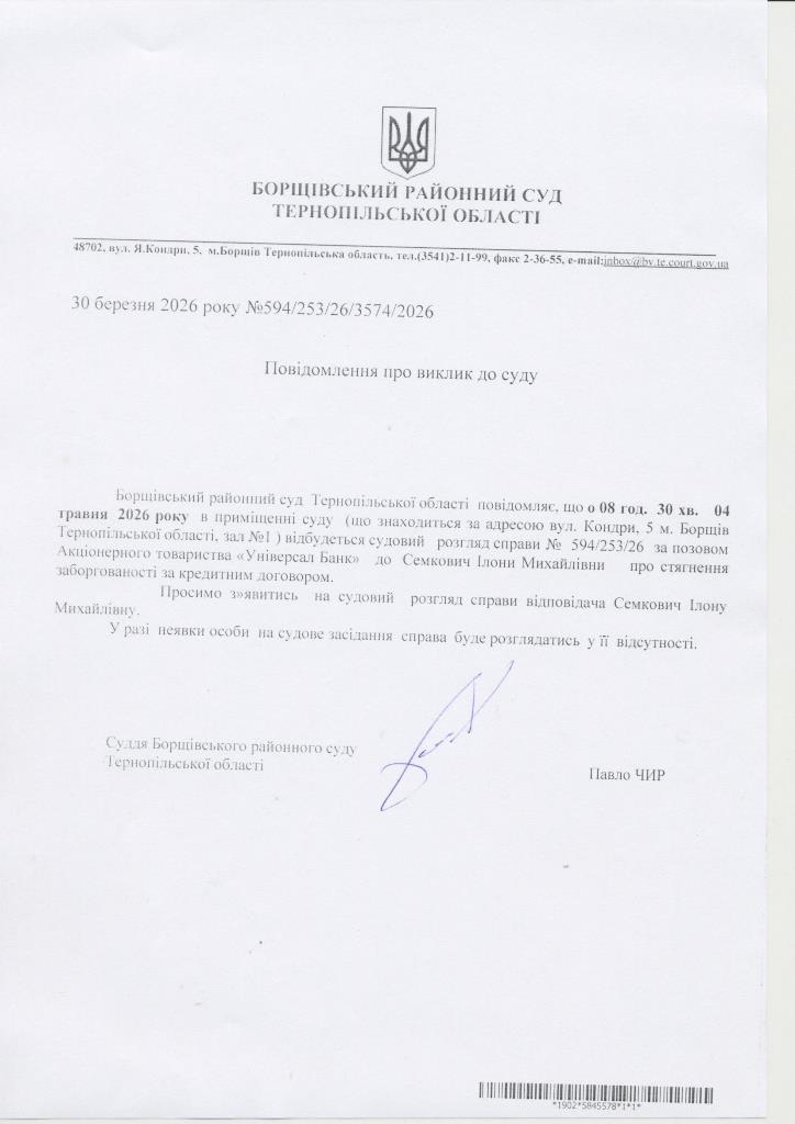 Повідомлення про виклик до суду Семкович Ілону Михайлівну