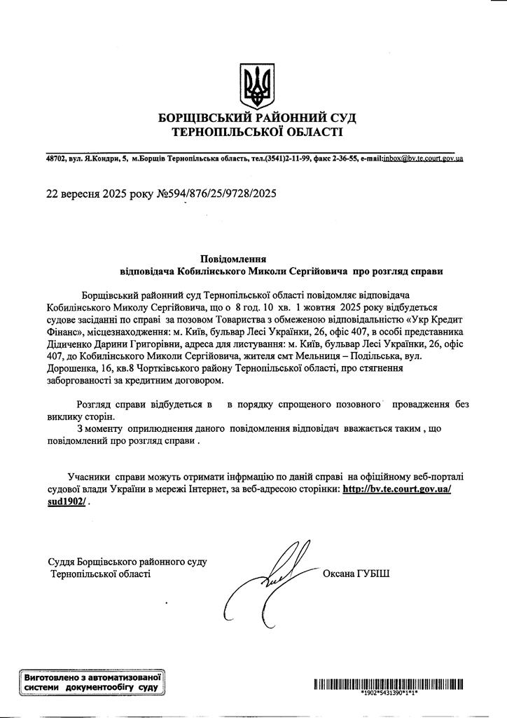 Повідомлення відповідача Кобилінського Миколи Сергійовича про розгляд справи