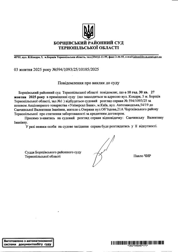 Повідомлення про виклик до суду Савчинську Валентину Іванівну