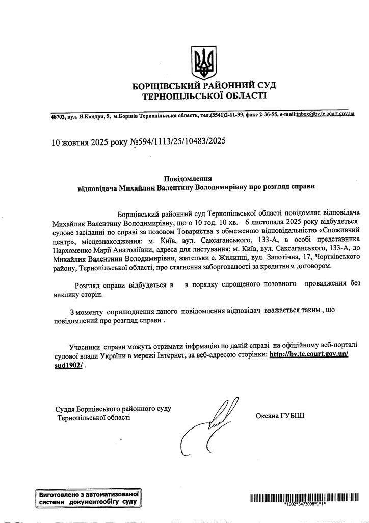 Повідомлення відповідача Михайлик Валентину Володимирівну про розгляд справи