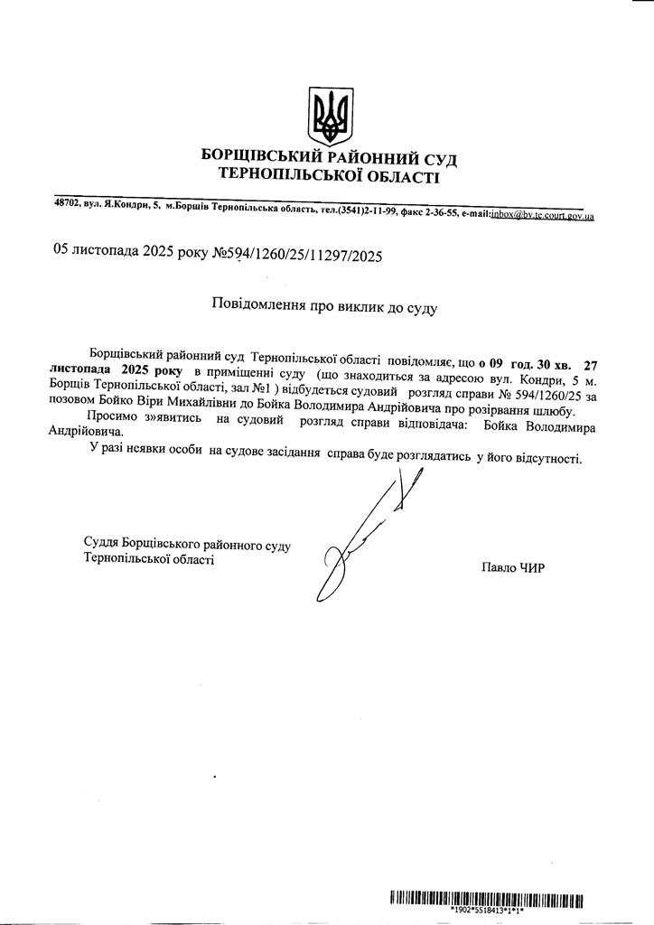 Повідомлення про виклик до суду Бойка Володимира Андрійовича