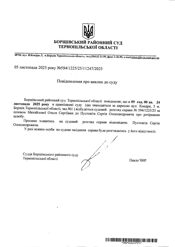 Повідомлення про виклик до суду Пустовіта Сергія Олександровича