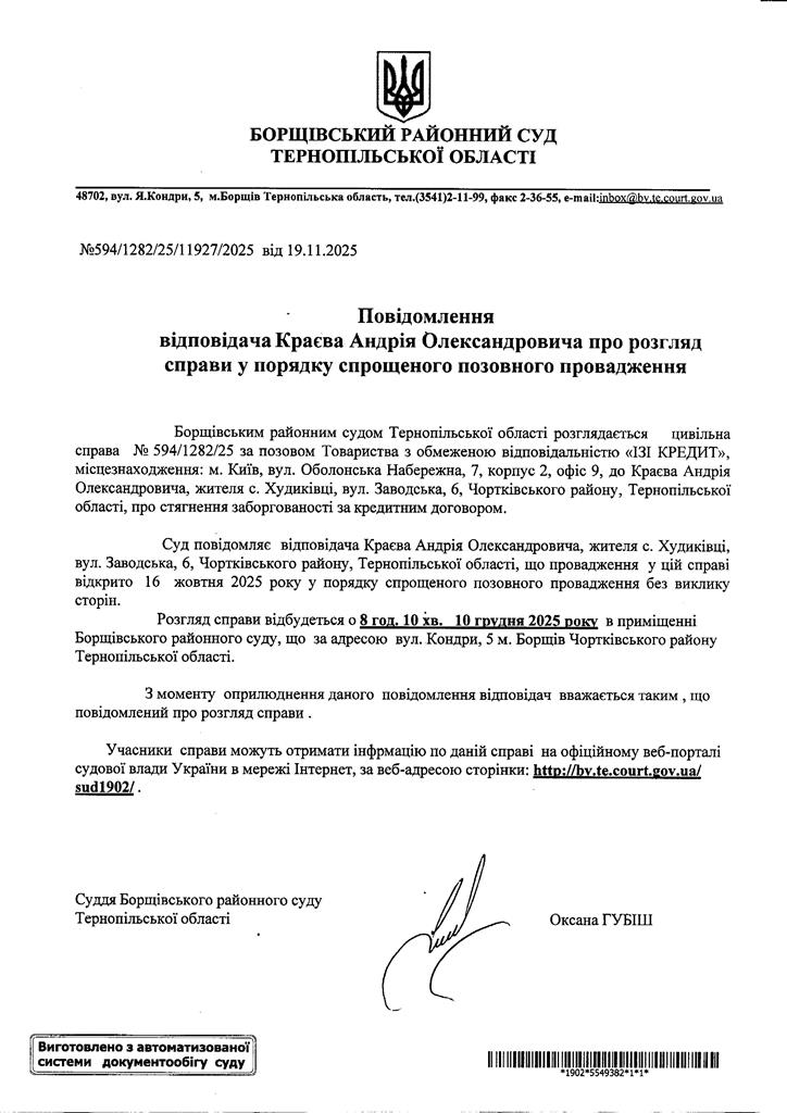Повідомлення відповідача Краєва Андрія Олександровича про розгляд справи у порядку спрщеного позовного провадження