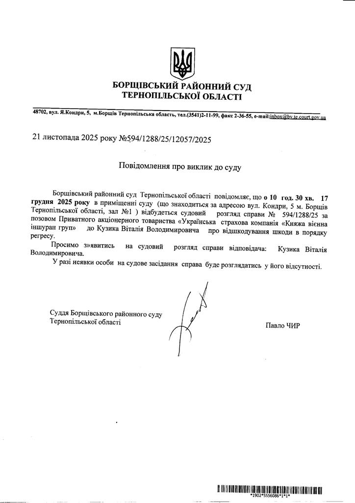 Повідомлення про виклик до суду Кузика Віталія Володимировича