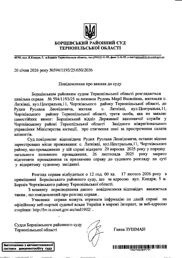 Повідомлення про виклик до суду Рудня Руслана Леонідовича