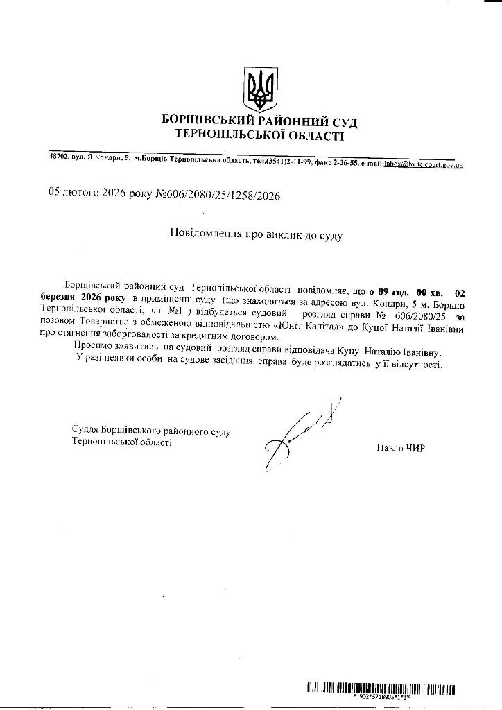 Повідомлення про виклик до суду Куцу Наталію Іванівну