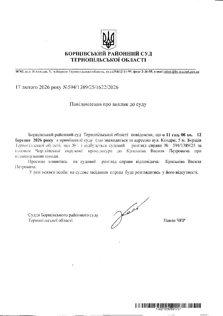 Повідомлення про виклик до суду Криськіва Василя Петровича