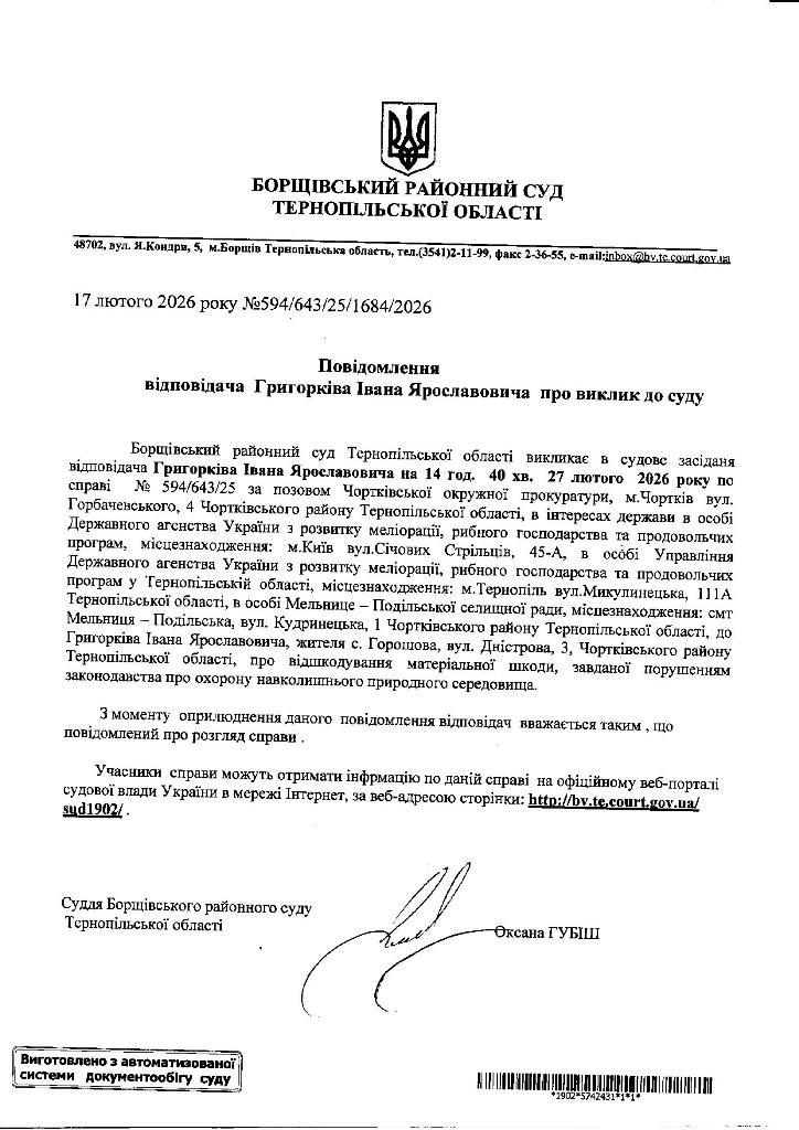 Повідомлення відповідача Григорківа Івана Ярославовича про виклик до суду