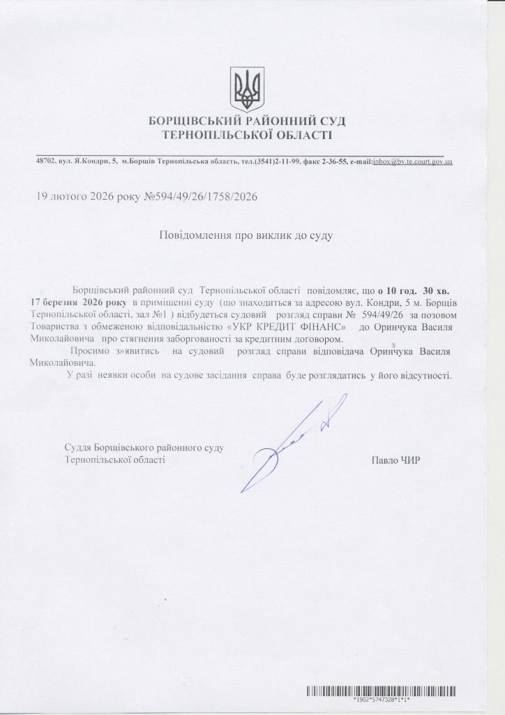 Повідомлення про виклик до суду Оринчука Василя Миколайовича