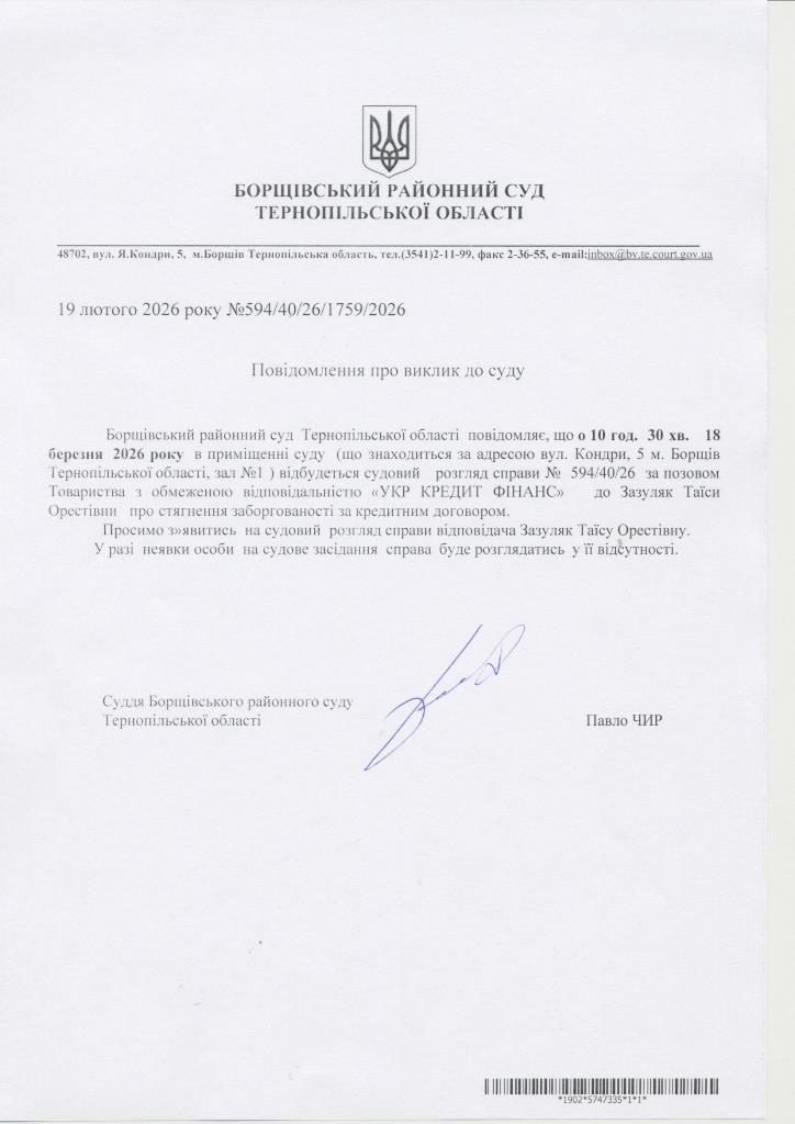 Повідомлення про виклик до суду Зазуляк Таїсу Орестівну