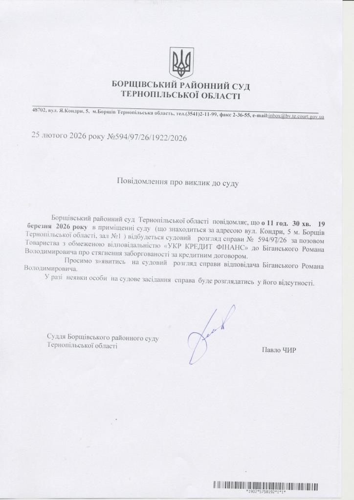 Повідомлення про виклик до суду Біганського Романа Володимировича