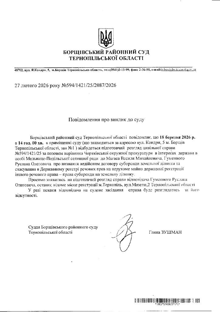 Повідомлення про виклик до суду Гуменного Руслана Олеговича
