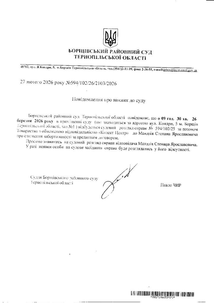 Повідомлення про виклик до суду Мандзія Степана Ярославовича
