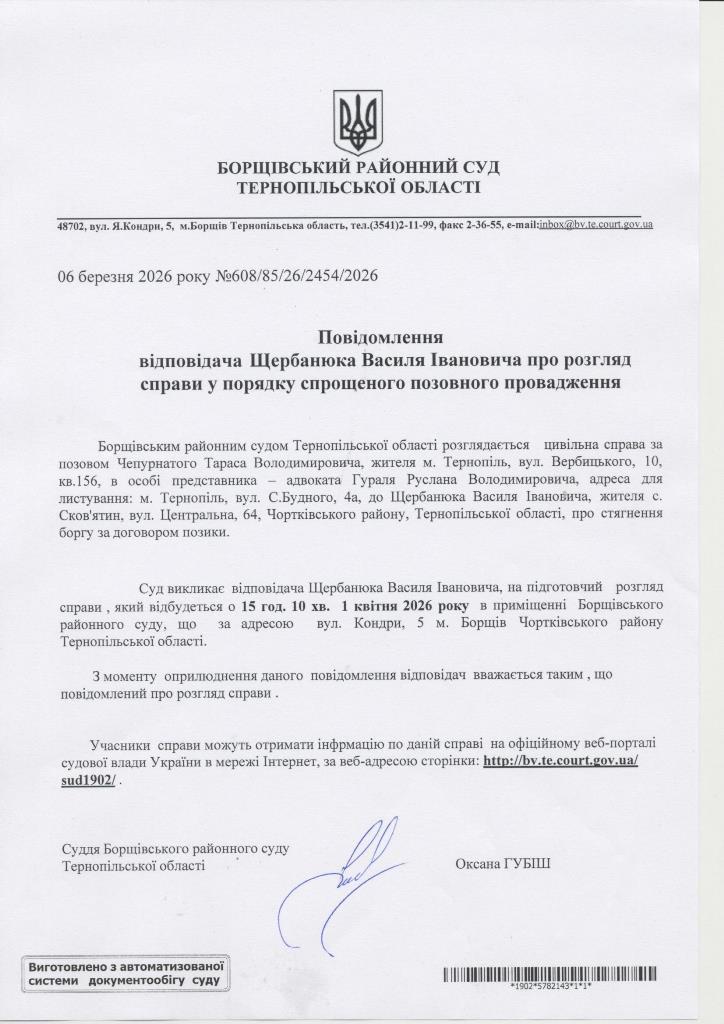 Повідомлення відповідача Щербанюка Василя Івановича про розгляд справи у порядку спрощеного позовного провадження