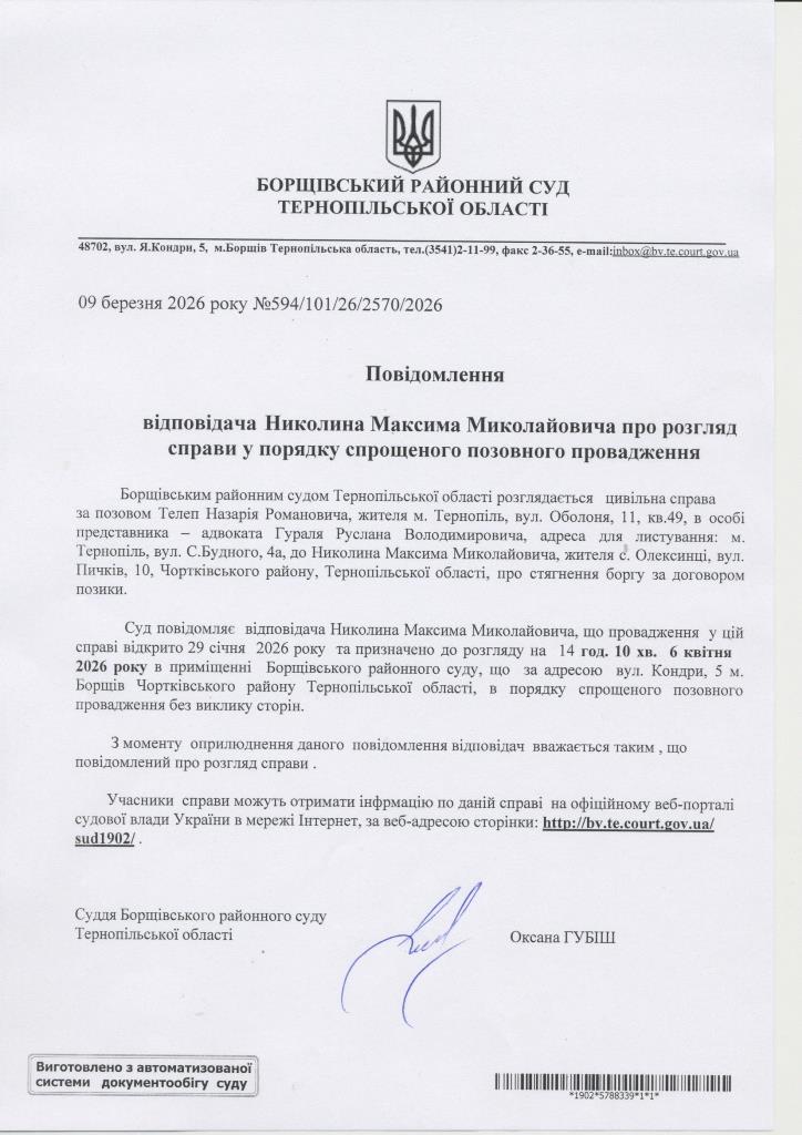 Повідомлення відповідача Николина Максима Миколайовича про розгляд справи у порядку спрощеного позовного провадження