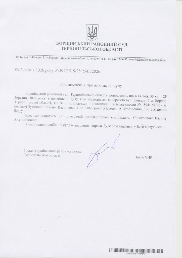 Повідомлення про виклик до суду Сивогривого Василя Анатолійовича