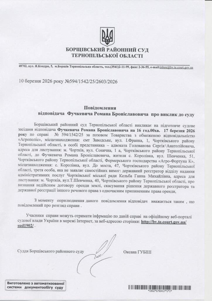 Повідомлення відповідача Фучкевича Романа Броніславовича про виклик до суду