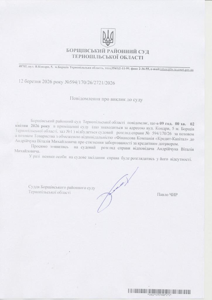 Повідомлення про виклик до суду Андрійчука Віталія Михайловича
